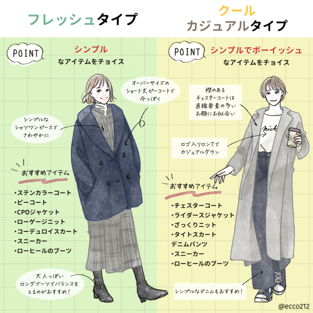 大人顔×曲線タイプのクールタイプ。直線タイプなのでシンプルでかっこいいアイテムをベースにしたコーデがオススメ。